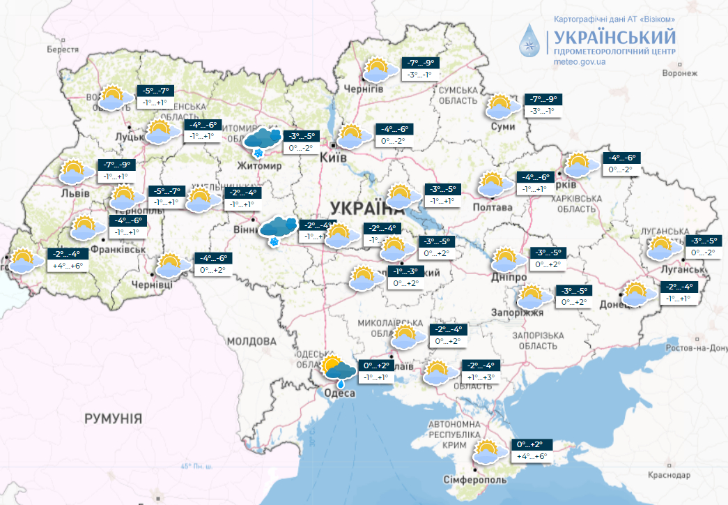 Детали: На дорогах западных и северных областей местами гололедица. Ветер юго-восточный, восточный, 5-10 м/с. Температура ночью 3-8° мороза, во Львовской, Черниговской и Сумской областях 6-11° мороза, в Одесской области и в Крыму от 2° мороза до 3° тепла; днем от 3° мороза до 2° тепла, на Закарпатье и крайнем юге страны 2-7° тепла.