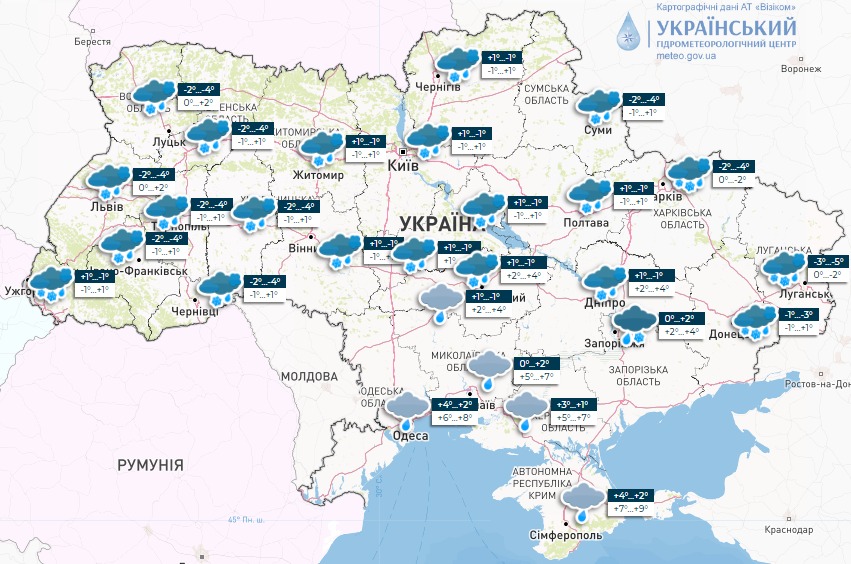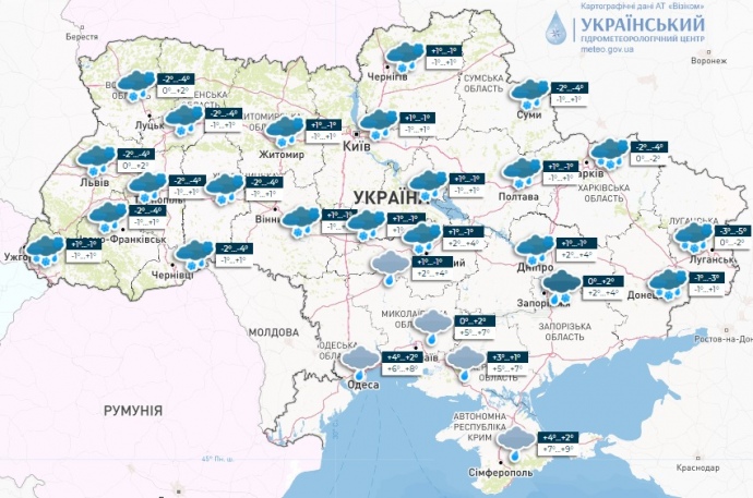 Детали: В Украине облачно. Временами небольшой, в восточных областях и на Закарпатье умеренный мокрый снег и дождь.