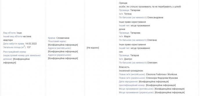 Детали: Согласно декларации, с 14 марта 2022 года партнерша Татарова арендует в Словакии квартиру в 137 м.кв. Указано, что там также проживают дети пары - Мария и Дмитрий.