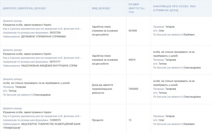 Официально Татаров получил от ГУД 500 тыс.грн зарплаты за 2022 год, а Татьяна Татарова - 40 тысяч от Национальной академии внутренних дел и 7 миллионов дохода от предпринимательской деятельности.