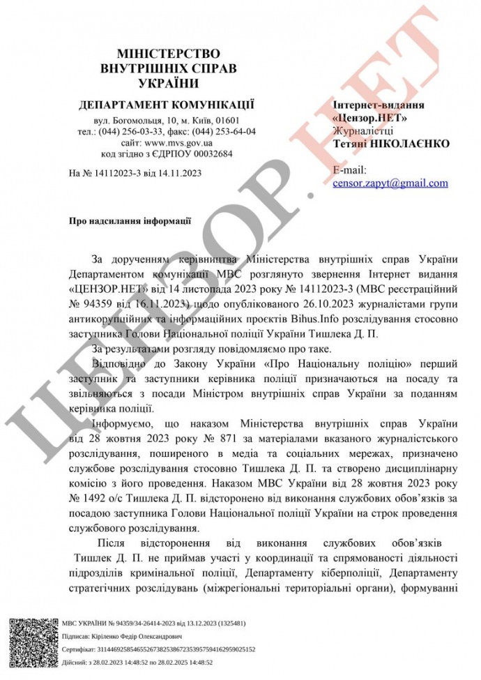 Что предшествовало: Издание Bihus.Info обнародовало расследование, что супруга заместителя главы Нацполиции Дмитрия Тишлека по состоянию на лето 2023 года не лишилась российского паспорта, а сам он пользуется недвижимостью и авто семьи партнера главаря ростовской криминальной группировки.
