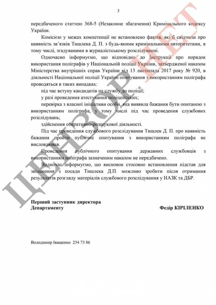 Дословно: "Служебное расследование не установило фактов, свидетельствующих о наличии связей Тишлека Д. П. с какими-либо уголовными авторитетами, в том числе, упоминаемыми в журналистском расследовании".