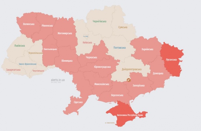 В большинстве областей Украины вечером 26 декабря объявили воздушную тревогу из-за угрозы применения баллистики.