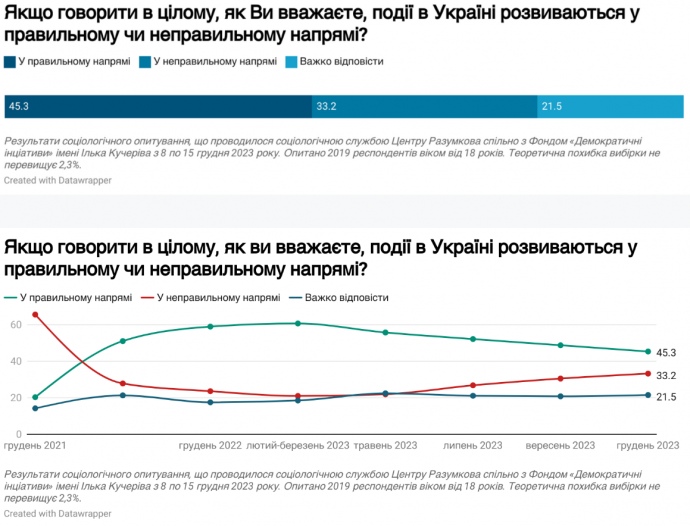 Дословно: "После начала полномасштабной агрессии России против Украины доля граждан, которые считают, что события в Украине развиваются в правильном направлении, существенно возросла (с 20% в декабре 2021г. до 51% в сентябре-октябре 2022г., достигнув самых высоких показателей в феврале-марте 2023г. (61%).