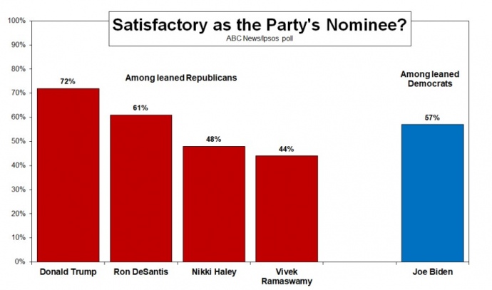 61% опрошенных был бы доволен Роном Десантисом. Другие кандидаты имеют более низкие показатели: Никки Хейли – 48%; Вивек Рамасвами – 44%; Крис Кристи (который снял свою кандидатуру в среду) – 23%; и Аса Хатчинсон – 17%.