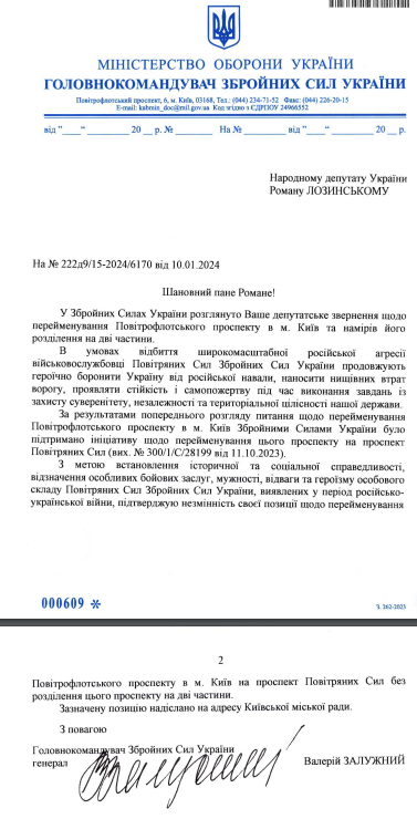 Прямая речь Залужного: "С целью установления исторической и социальной справедливости, празднования боевых заслуг, мужества, отваги и героизма личного состава Воздушных сил, подтверждаю неизменность своей позиции по переименованию Воздухофлотского проспекта в Киеве на проспект Воздушных сил без разделения проспекта на две части.
