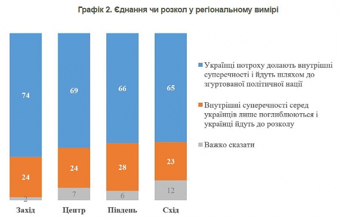 Сейчас же во всех регионах большинство населения считают, что украинцы преодолевают внутренние противоречия и идут по пути сплочения.