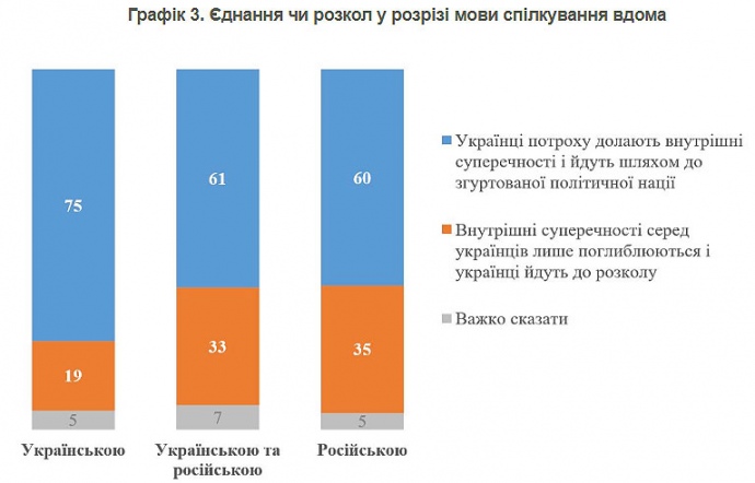 Социологи указывают, что среди украиноязычных респондентов доля таких респондентов немного выше (75%). Но и среди русскоязычных большинство (60%) имеют оптимистичные мысли относительно единения украинцев.