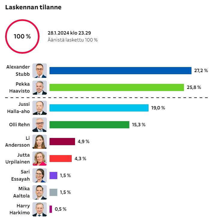 Детали: Стубб получил 27,2% голосов. За Хаависто проголосовали 25,8% избирателей.