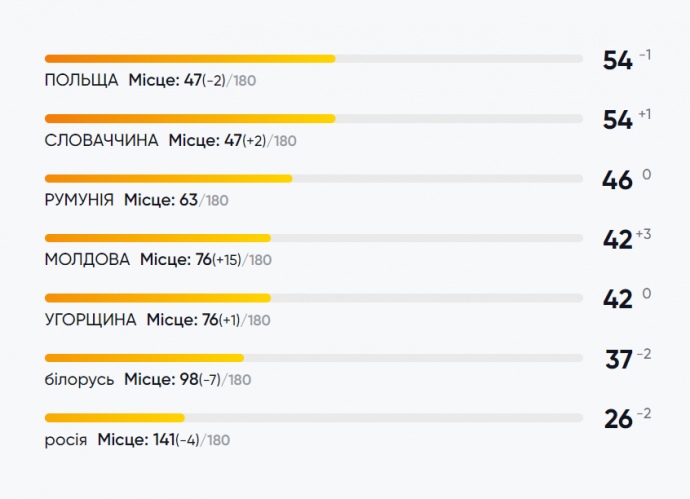 Среди западных соседей показатель Румынии остался без изменений (46 баллов, 63 место), тогда как Польша потеряла еще 1 балл, но осталась одной из лидеров по показателям СРІ среди близких к Украине стран - с 54 баллами она занимает 47 место. Однако теперь Польша делит эту строчку со Словакией - за год эта страна добавила 1 пункт и тоже набрала 54 балла. Баллы Венгрии не изменились (76 место с 42 баллами).