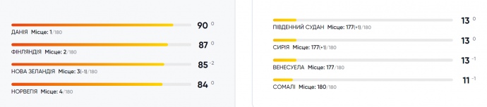 Аутсайдеры рейтинга тоже остались неизменными. Сомали потеряло 1 пункт и с 11 баллами занимает последнее 180 место. А к Южному Судану и Сирии, которые набрали по 13 баллов и занимают 177 строчку, Венесуэла добавилась с такими же показателями.