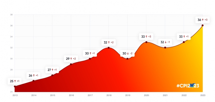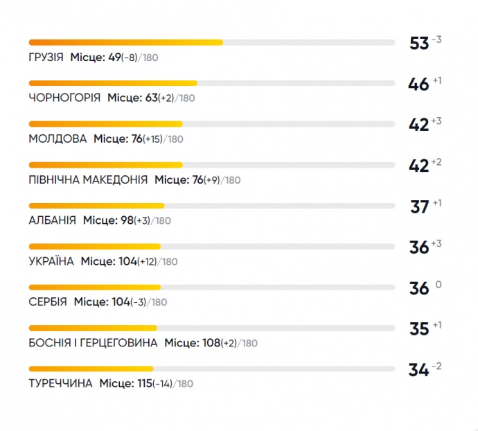 Рост Украины на 3 балла - один из лучших результатов за прошлый год в мире. Также Украина стала одной из 17 стран в нынешнем СРІ, продемонстрировавших свой лучший показатель за все время.