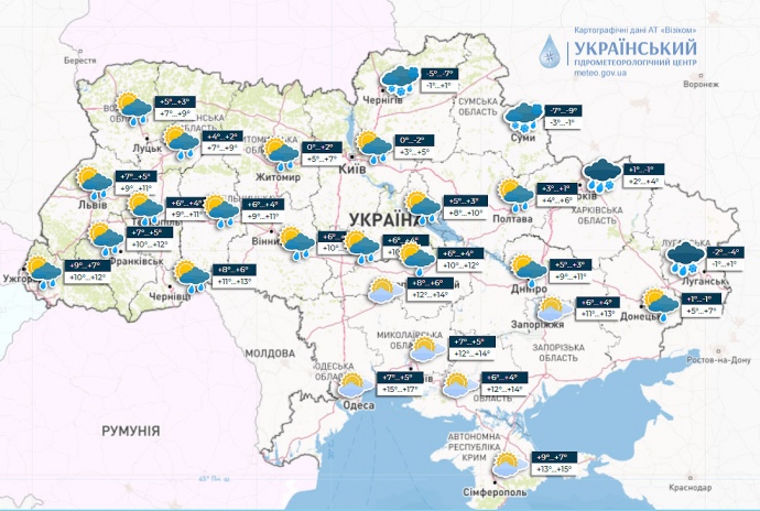 10 февраля по всей территории Украины, кроме юга, дожди, на северо-востоке и востоке − дождь со снегом. В северной и восточной частях ночью от 2° тепла до 3° мороза, днем от 1° мороза до 5° тепла (на Черниговщине и Сумщине ночью 6-11° мороза, днем 0-5° мороза), на остальной территории ночью 0-6° тепла, днем 6-12°, в Одесской области и в Крыму до плюс 16°.
