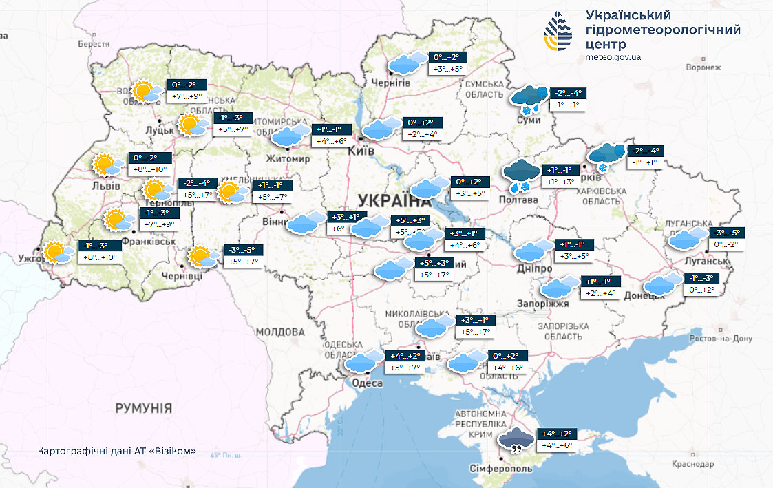 Температура в восточных и Сумской областях ночью 1-7° мороза, днем около 0°, на остальной территории ночью от 2° тепла до 3° мороза, днем 1-6° тепла, в Одесской области до 9°, 16-17 февраля на западе страны 7-12° тепла.