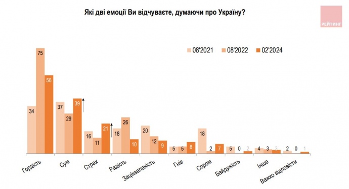 По данным опроса социологической группы "Рейтинг", в феврале среди граждан при мнении об Украине выросли ощущение печали и страха, в то же время уменьшилось количество тех, кто испытывает гордость, по сравнению с 2022 годом.