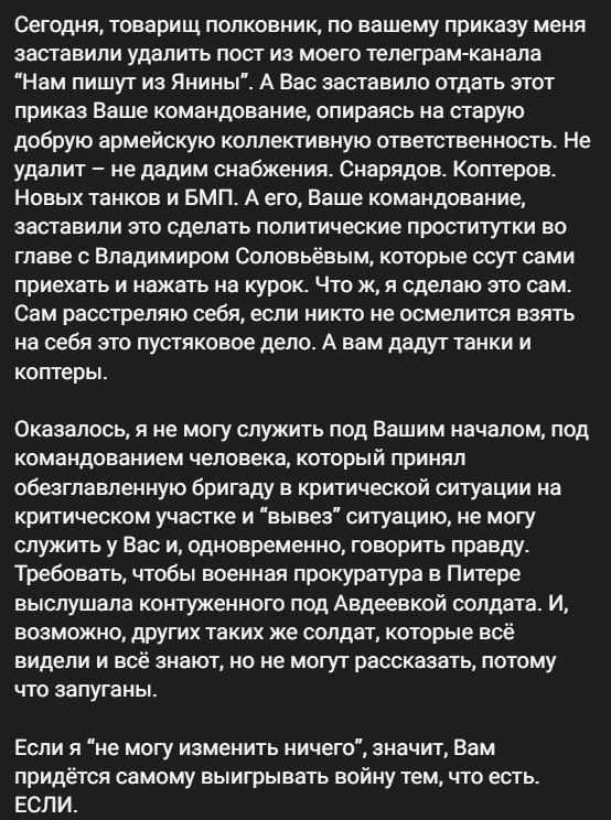 Он сообщил, что после сообщения о потерях россиян, командование заставило его удалить пост из-за давления "политических проституток во главе с Владимиром Соловьевым, которые сосут сами приехать и нажать на курок".