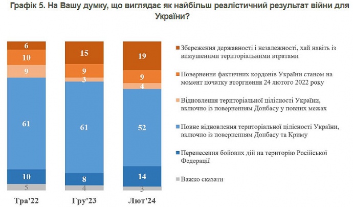 По состоянию на февраль количество украинцев, которые считают реалистичным сценарий полного восстановления территориальной целостности немного уменьшилось, по сравнению с маем 2022 года, но сейчас все равно подавляющее большинство опрошенных верят, что война закончится возвращением к границам 1991 года.