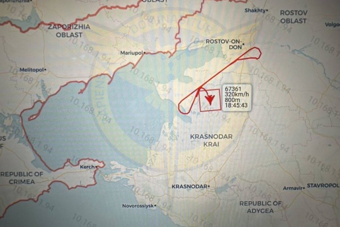 Детали: Сообщается, что резкое падение скорости и высоты подбитого самолета А-50У зафиксировано вблизи города Ейск.