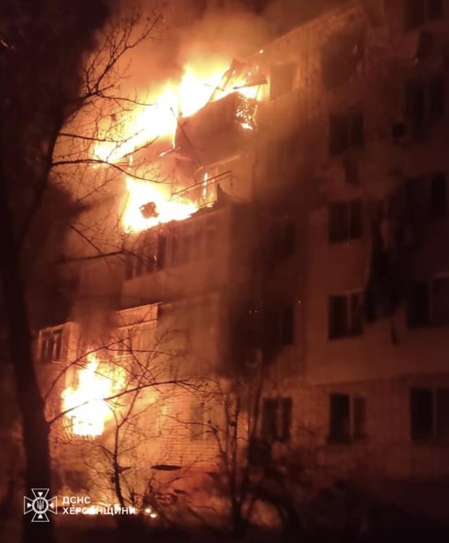 Ночью 18 марта российские захватчики обстреляли один из микрорайонов Херсона − в результате попадания боеприпаса горел жилой 5-этажный дом.