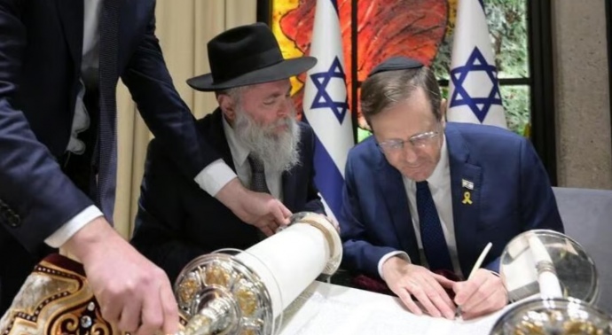 Президент Украины Владимир Зеленский написал первую букву, а президент Израиля Исаак Герцог - последнюю в свитке Торы солидарности, который должен символизировать мир и единство между двумя странами.