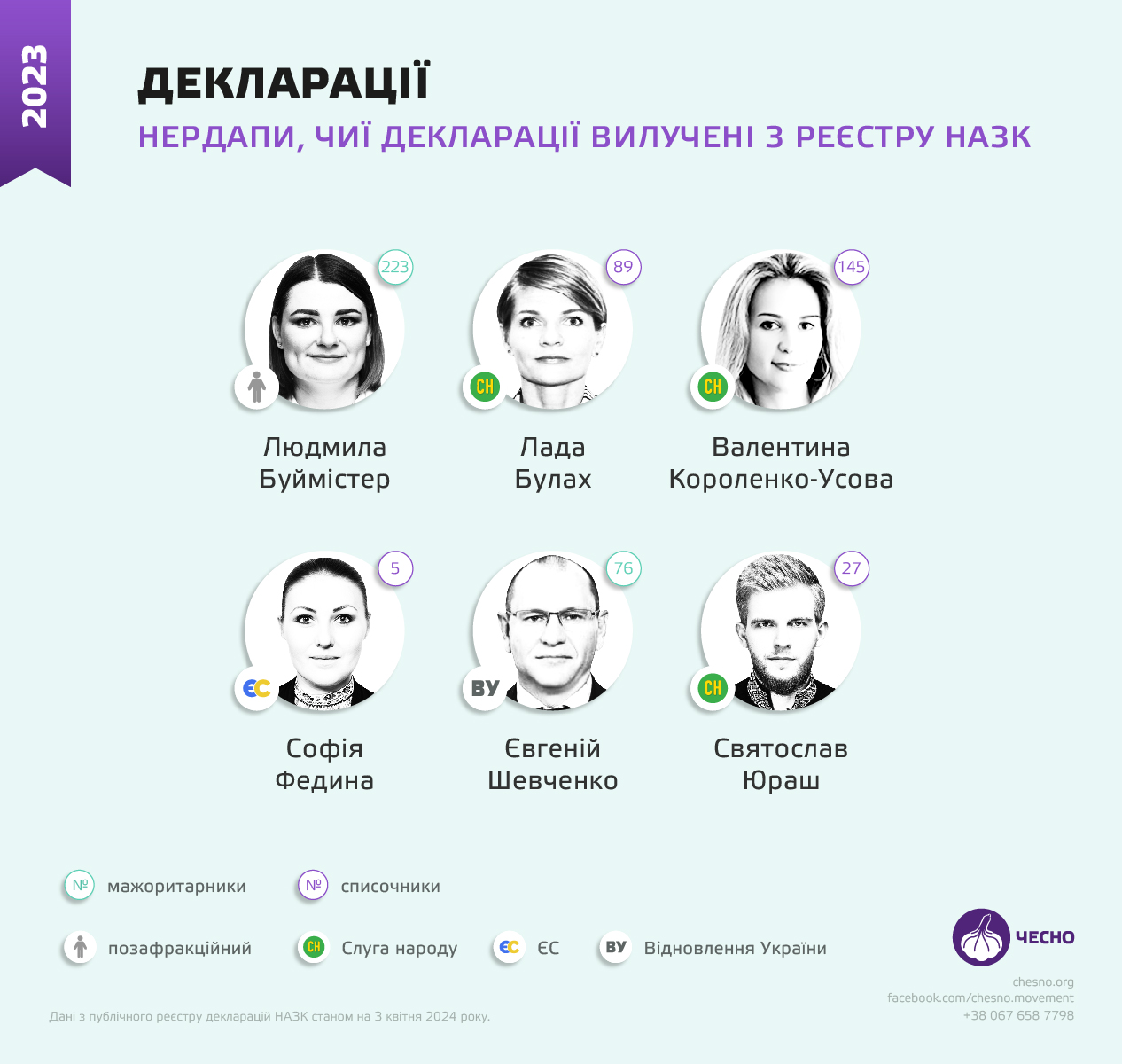 В реестре НАПК отсутствуют декларации за 2023 год 10 действующих народных депутатов - 4 из них не подали декларации, а информацию о 6 нардепах изъяли из публичного реестра.