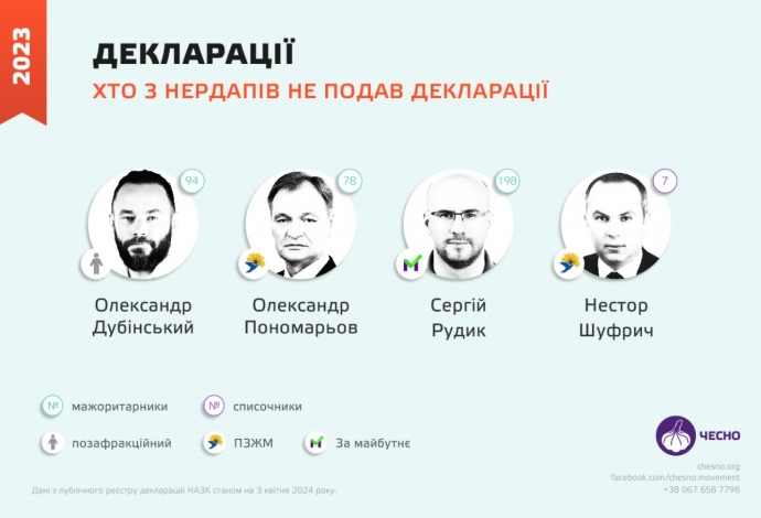 Дословно: "Трое нардепов ВРУ, которые не подали декларации за 2023 год - это депутаты, которые имеют подозрения в государственной измене - Нестор Шуфрич и Александр Пономарев от запрещенной ОПЗЖ, а также экс-слуга, который сейчас является внефракционным Александр Дубинский.