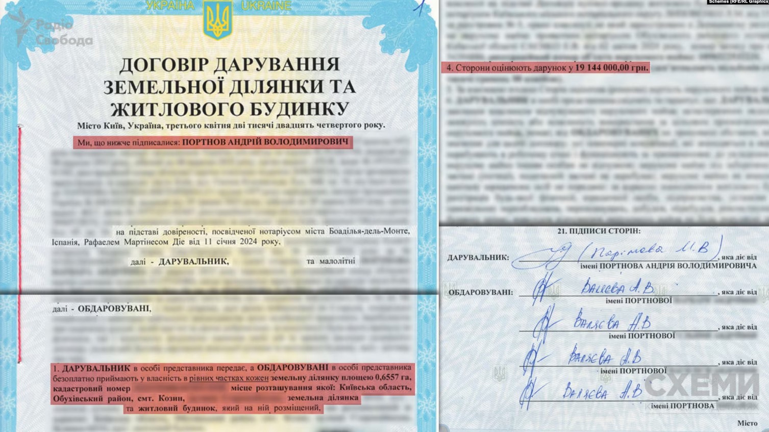 В договоре дарения отмечается, что дом общей площадью более 1000 квадратных метров и земельный участок в 0,65 гектара в закрытом коттеджном поселении на берегу Днепра равными частями получили в качестве подарка от Портнова четверо его несовершеннолетних детей.