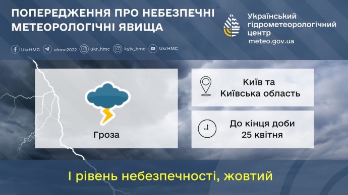 Из-за грозы 25 апреля и до конца суток в Киеве и Киевской области объявили желтый уровень опасности.