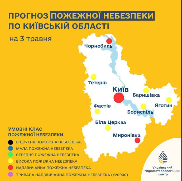 Дословно: "По данным Укргидрометцентра, в пятницу, 3 мая в Киеве будет преобладать чрезвычайный уровень пожарной опасности. Погодные условия будут способствовать повышенной вероятности возникновения и распространения пожаров в экосистемах, при наличии источников возгорания (открытого огня)".