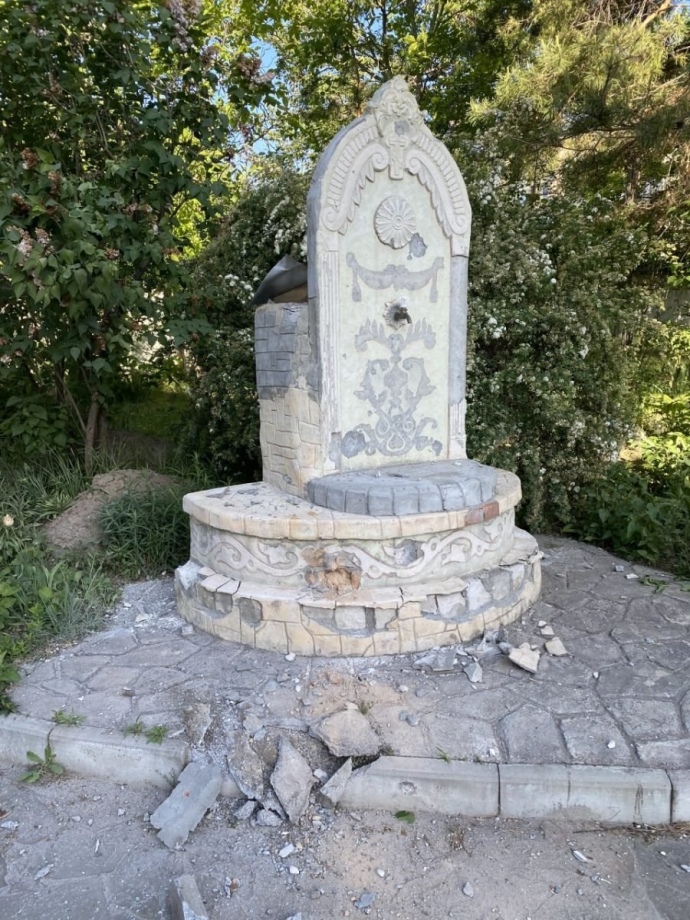 Дословно: "В результате обстрела был изуродован центральный вход, местами пробита металлическая кровля, выбито несколько окон.