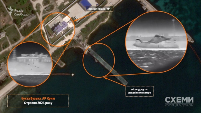 Журналисты "Схем" опубликовали спутниковые снимки с места удара украинской разведки по скоростному российскому катеру во временно оккупированном Крыму в ночь на 6 мая.