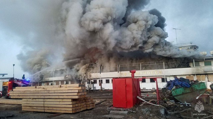 В порту российского Архангельска горит теплоход "М.В. Ломоносов". Он находился на ремонте и незадолго перед пожаром на нем проводились сварочные работы.