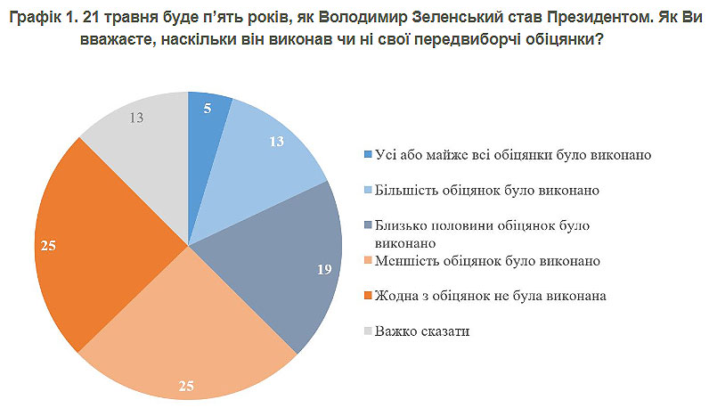 Дословно социологи: "18% респондентов ответили, что В. Зеленский выполнил большинство или все обещания (из них о выполнении всех обещаний говорят 5%). Почти столько же считают, что он выполнил около половины обещаний, а 50% считают, что он выполнил меньшинство или ни одного из обещаний (из них 25% считают, что он не выполнил ни одного обещания)".