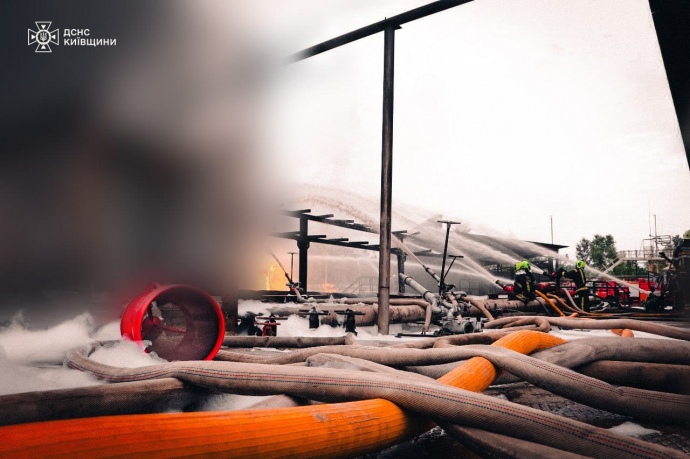 Спасатели третьи сутки тушат пожар на промышленном объекте в Киевской области, который возник утром 12 июня в результате российской атаки.