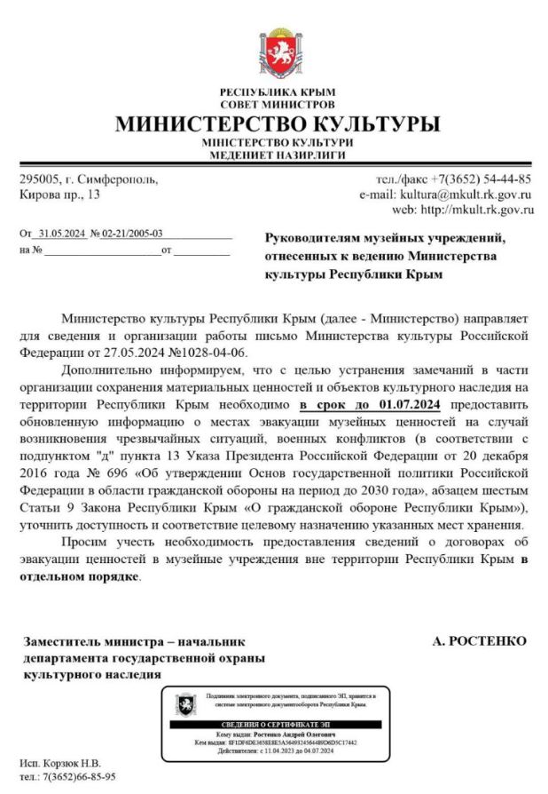 Подписал письмо - "заместитель министра культуры Андрей Ростенко". Он бывший глава оккупационной администрации Ялты.