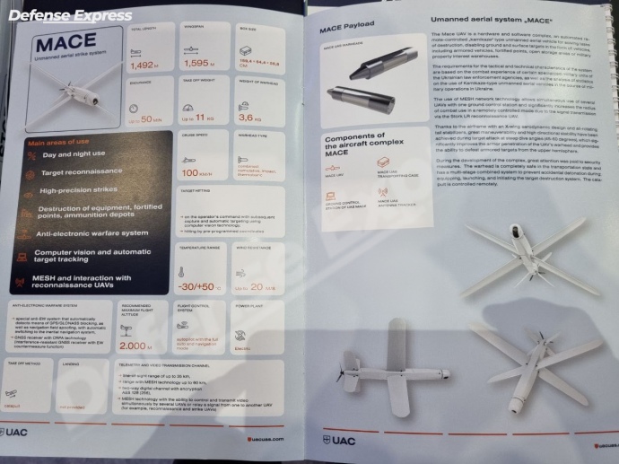 Детали: Дрон был представлен компанией UAC на стенде Национальной ассоциации предприятий оборонной промышленности Украины (NAUDI). Что касается названия, то в брошюре он назван Mace, но надпись на крыльях прямо говорит, что его оригинальное название именно украинское - "Булава".