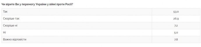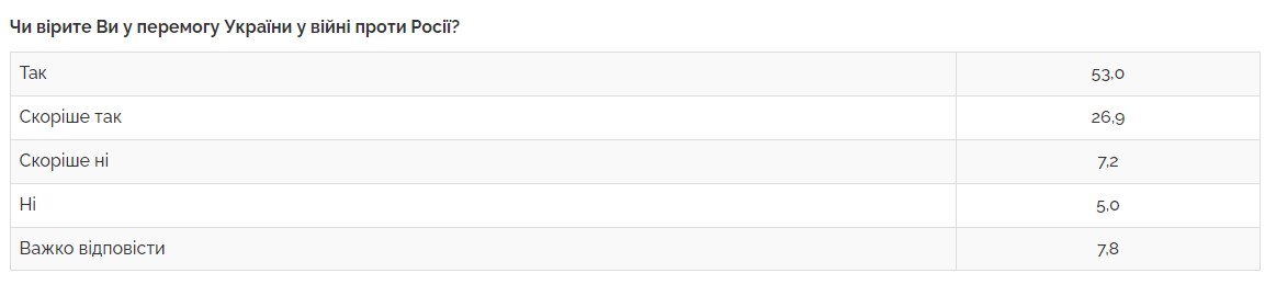 Дословно: "80% опрошенных верят в победу Украины в войне, не верят - 12%...