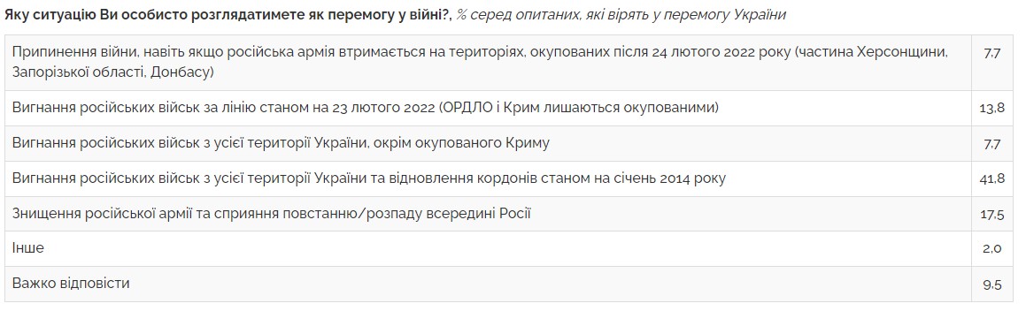 14% будут считать победой восстановление статус-кво по состоянию на 23 февраля 2022 года, 8% - изгнание российских войск со всей территории Украины, кроме оккупированного Крыма, а 8% - прекращение войны, даже если российская армия останется на территориях, которые были захвачены в результате полномасштабного вторжения (после 24 февраля 2022 года)".