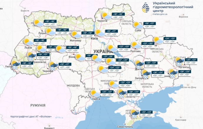 19 июля в Украине без осадков, лишь на Закарпатье, в Карпатах, днем и в юго-восточных областях местами кратковременные дожди, грозы. Температура в западных и северных областях Украины ночью 14-19°, днем 24-29°. На остальной территории ночью 20-25°, днем в центральных областях 29-34°, на юге и востоке страны сильная жара 35-38°. Ветер преимущественно северный, 5-10 м/с.