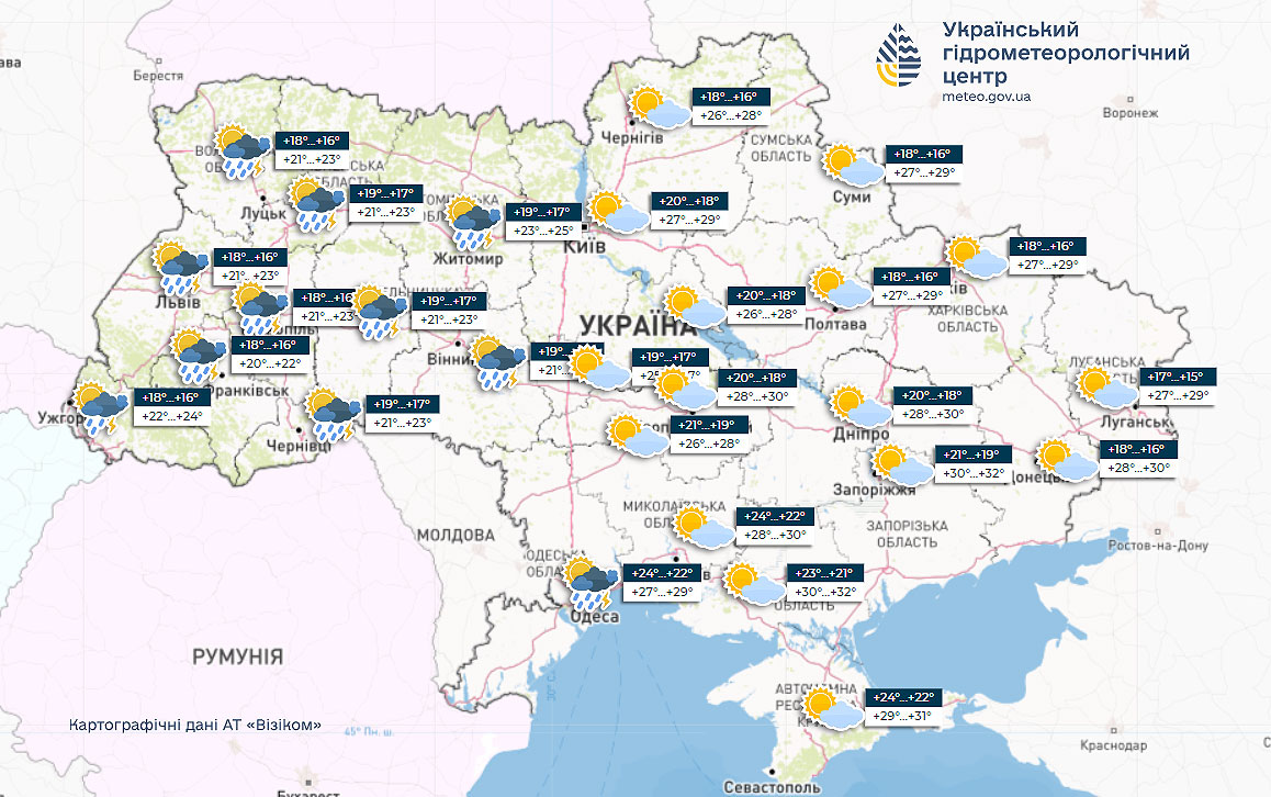 На юге ночью 18-23°, днем 27-32°; на остальной территории ночью 13-18°, днем 25-30°, в западных, Винницкой и Житомирской областях 19-24° (в Карпатах ночью 9-14°, днем 14-19°). Ветер преимущественно восточный, на западе северо-западный, 3-8 м/с.