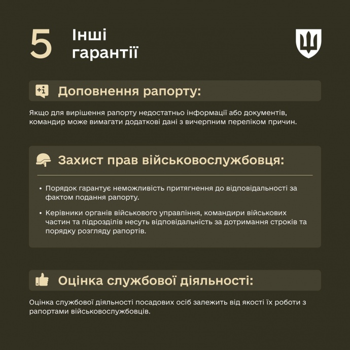 - Гарантировано рассмотрение рапортов по военной дисциплине, боевым задачам, здоровью личного состава и отпускам не позднее 48 часов после подачи.