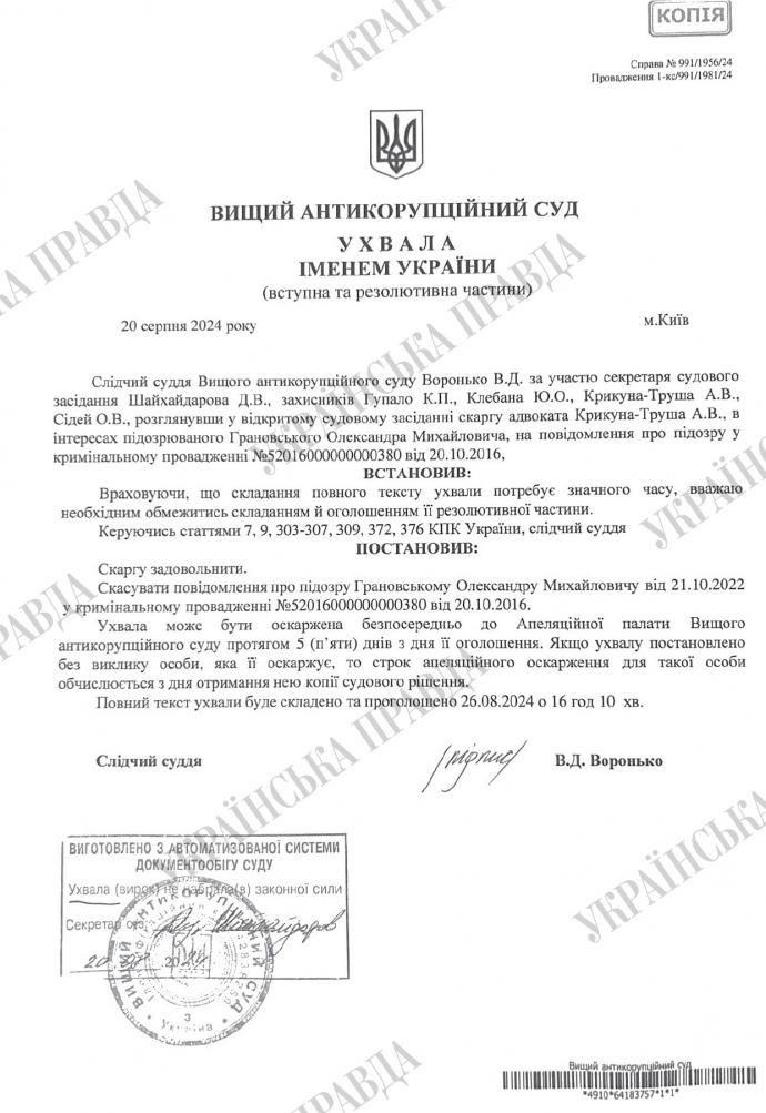 Дословно: "Отменить сообщение о подозрении Грановскому Александру Михайловичу от 21.10.2022 в уголовном производстве Nº52016000000000380 от 20.10.2016.