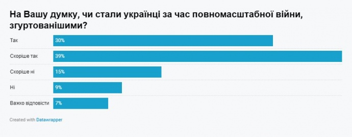 Детали: Согласно результатам опроса, 30% респондентов полностью убеждены в том, что общество сплотилось во время полномасштабной войны, еще 39% скорее убеждены в этом, это составляет в целом 69%.