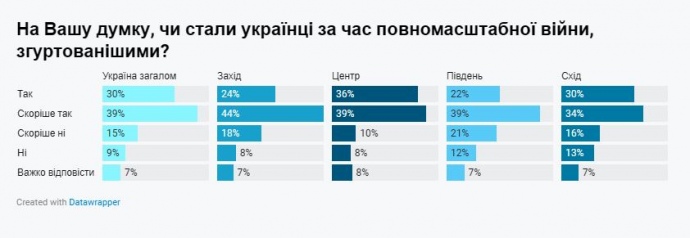 Зато 24% из числа опрошенных считают, что этого не произошло. Тех, кто не видит большей сплоченности после полномасштабного вторжения, больше всего на Юге (32%), Востоке (29%), Западе (26%), а меньше всего в Центре (18%).