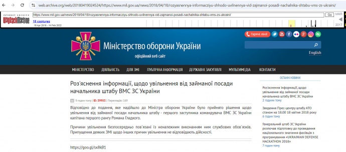 Сейчас по ссылке об увольнении Гладкого информация на сайте Минобороны отсутствует. О прошлом наличии такого сообщения говорит лишь надпись в самой ссылке.
