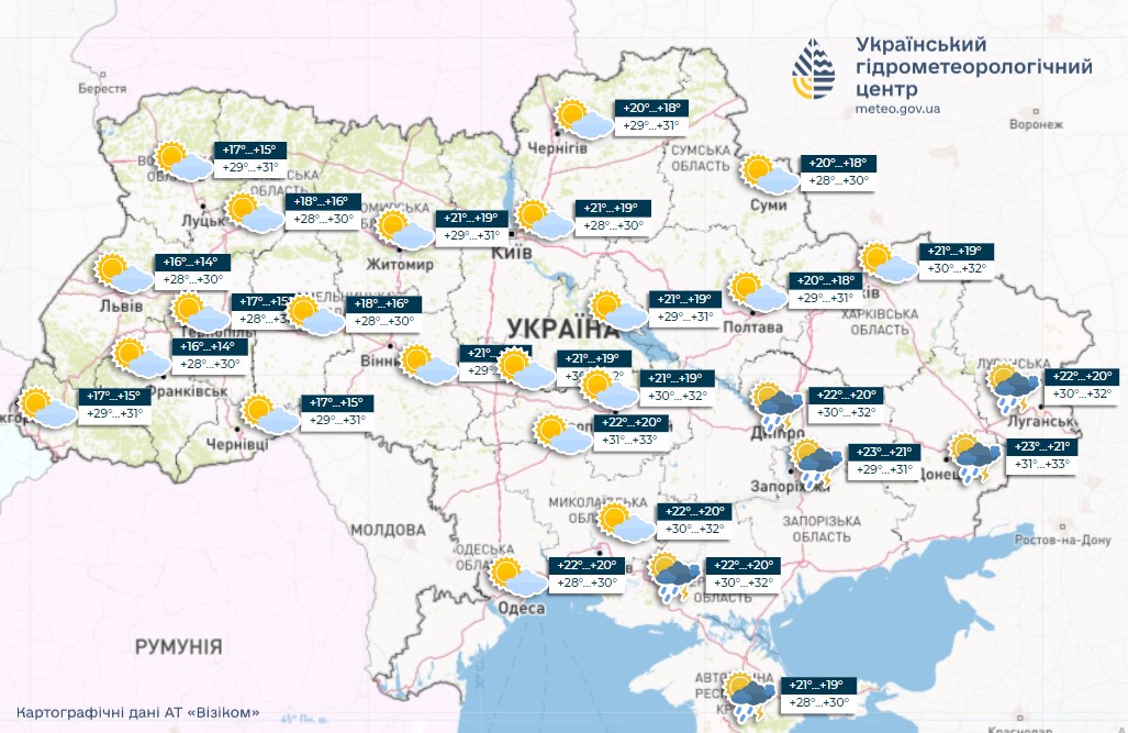 Температура ночью 17-22°, днем 27-32°; в Киеве ночью около 20°, днем 28-30°.