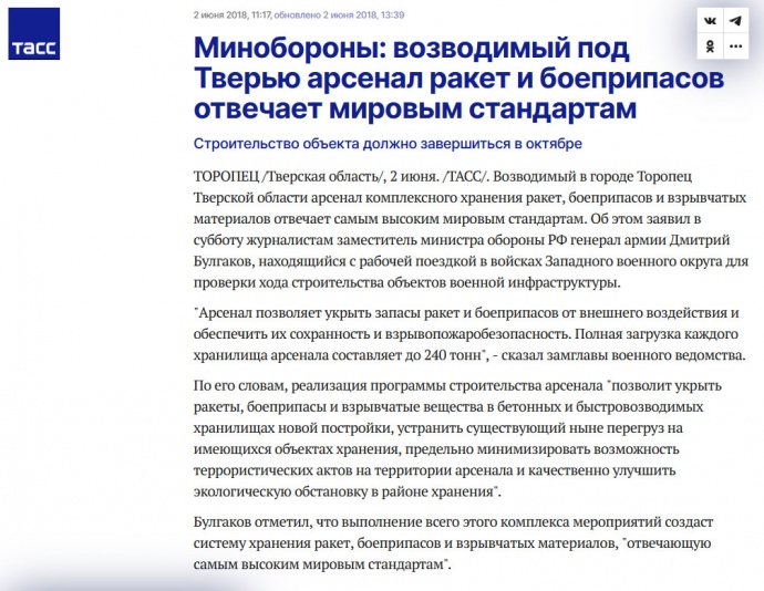 - В городе Торопец в 2018 году построили Арсенал комплексного хранения ракет, боеприпасов и взрывчатых материалов.