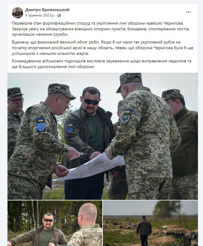 В Facebook Брижинского действительно есть пост от мая 2023 года, в котором он одобрительно отзывается об укреплениях, но при этом отмечает, что "командованию военных подразделений высказал замечания по исправлению недостатков и еще большего усовершенствования линии обороны".