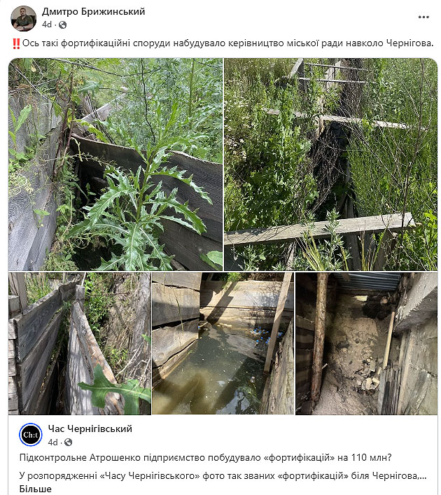 Прямая речь и.о. мэра: "После введения в Чернигове городской военной администрации, в мае 2023 года, ее начальник, осмотрев линию сооружений, оценил их высокое качество и дал поручение военным, под его наблюдением, усовершенствовать линию оборонительных сооружений вокруг города. К сожалению, на прошлой неделе мы увидели результат этого "совершенствования" на фото в некоторых пабликах. Не считаю, что этот вопрос стоит обсуждать публично, но, если его уже поднял начальник ГВА, то подчеркну – Совет обороны области должен рассмотреть не только вопрос сооружений, но и соответствия Брижинского занимаемой должности, который взялся "совершенствовать" оборонительные сооружения, качество сооружения которых получило высокую оценку".