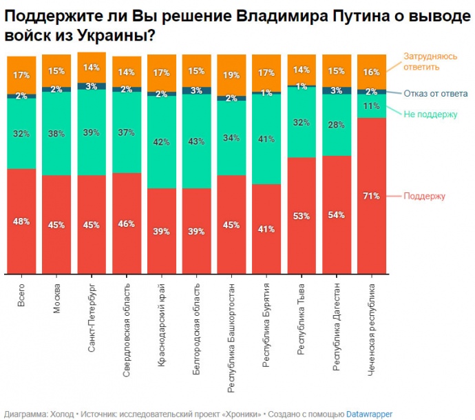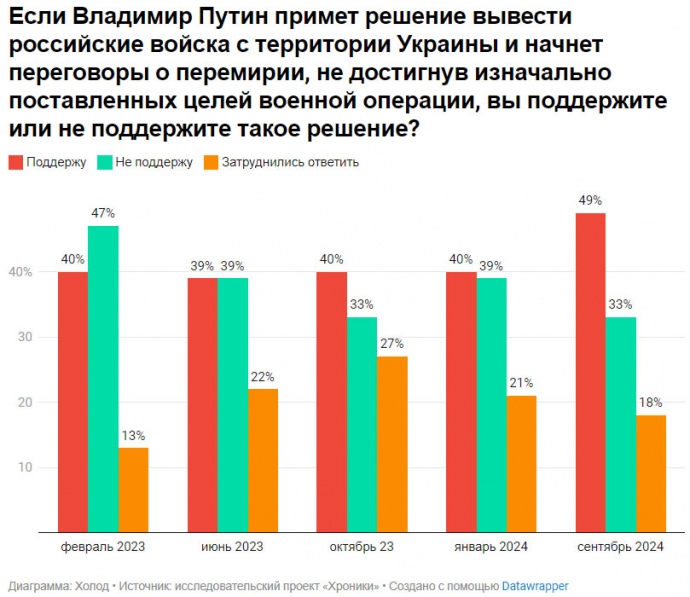 "Холод" подчеркивает, что в условиях войны полностью доверять результатам опросов общественного мнения невозможно, поскольку "россияне могут бояться выступать против позиции, которую диктуют государство и пропаганда".